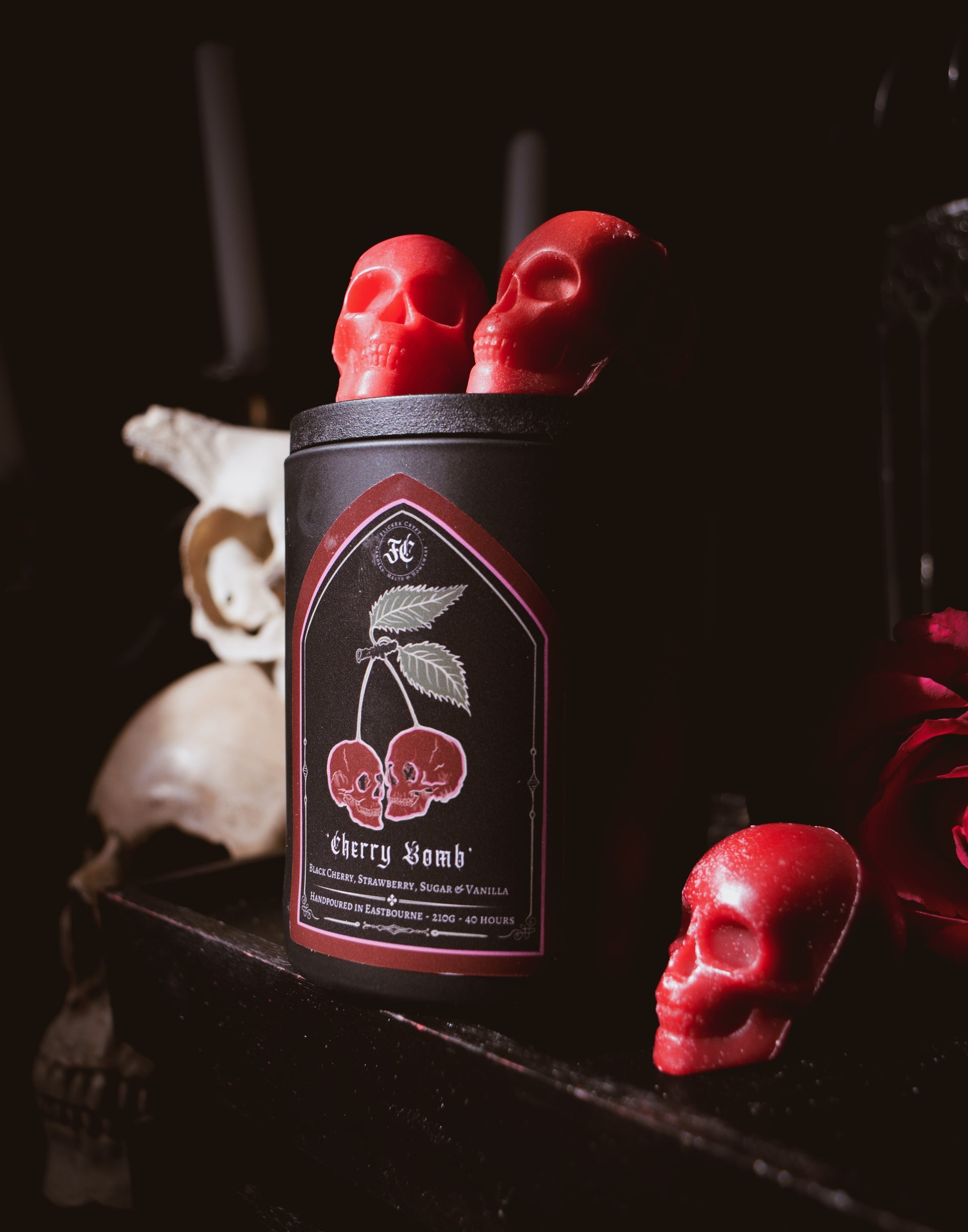1 x 'Cherry Bomb' 30cl candle and a box of 6 3D Skull melts. Give your home that extra dash of cherry aroma with a combined candle and melt bundle! With scrumptious notes of black cherry and vanilla.