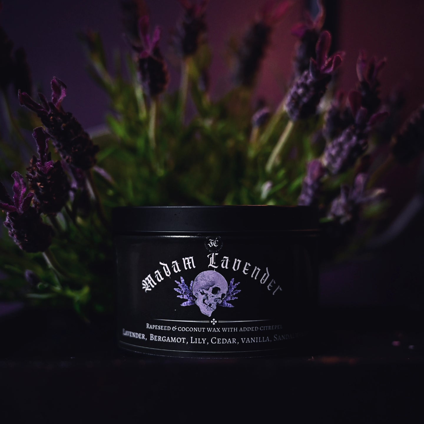 Introducing Madam Lavender - part of the Gardenia collection, a range of tinned candles for outdoor use with added Citrepel.